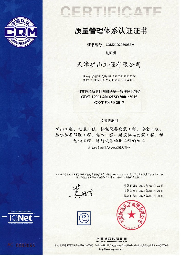 天津礦山工程有限公司(以下簡稱公司)始建于1965年,隸屬中國建材集團有限公司,是從事礦山總承包、礦山開采運營、礦山設計與咨詢、土石方爆破、生態恢復治理、鋼結構制作安裝、機電設備安裝以及工程測量的專業化礦山施工企業和礦山開采運營總承包服務商。具備礦山總承包和爆破雙一級資質。 公司始建于1965年,總部位于天津市···